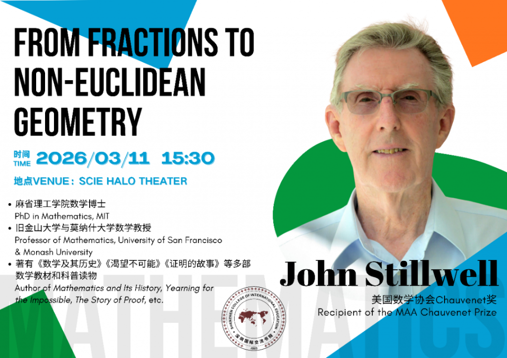 On March 11, 2026, the renowned mathematician Prof. John Stillwell visited SCIE and gave a wonderful talk on non-Euclidean geometry. The professor explained the patterns of non-Euclidean geometry from a pure math perspective, and cleverly connected mathematical theories to physics research, helping students on site to see clearly the key role math plays in the development of science.