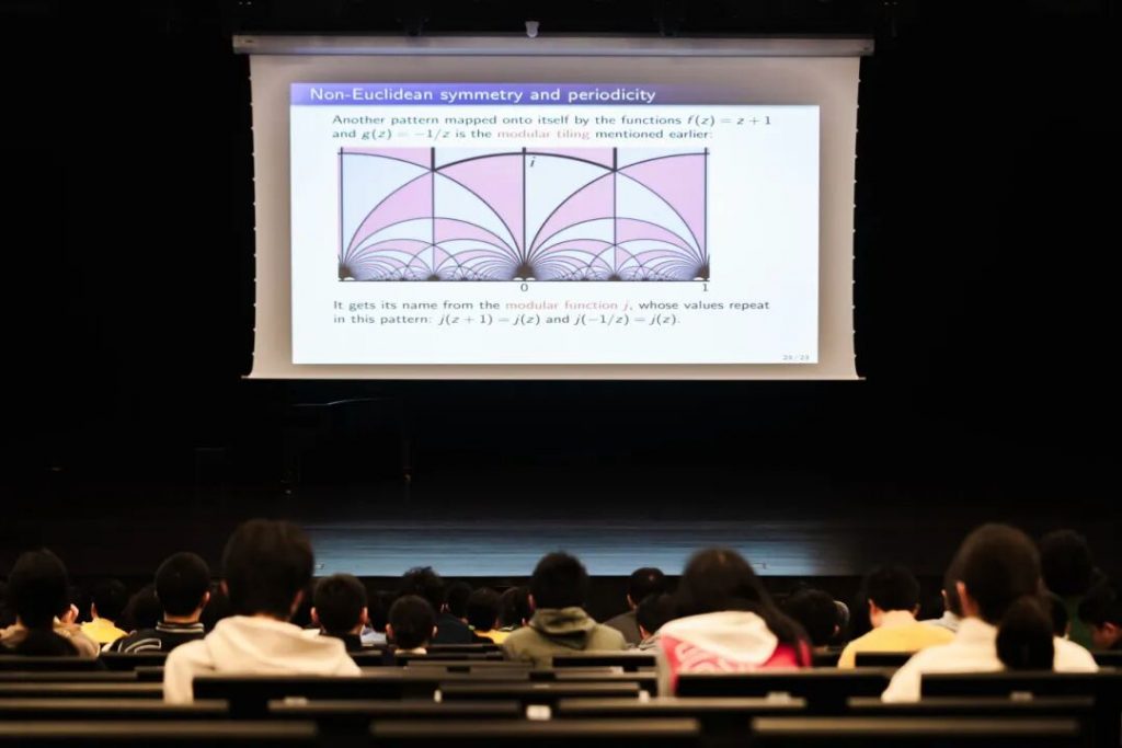 At the end of the lecture, the professor introduced the concept of complex numbers, using functions like z→z+1 and z→-1/z to demonstrate the self-mapping transformations of Ford circles and modular tiling patterns. The seemingly intricate symmetries and periodicities of non-Euclidean geometry could be precisely expressed through these simple complex functions. Furthermore, modular functions, as a vital starting point for modern pure mathematics research, clearly revealed to the audience the beauty of the progressive and interconnected layers of mathematical knowledge.