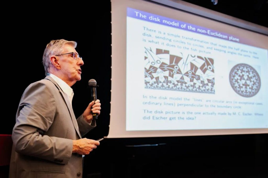 From the half-plane model to the disk model, the professor also shared the beautiful intersection where mathematics met art. The mathematician Donald Coxeter provided the artist M. C. Escher with the idea of using the disk model of non-Euclidean geometry for his tiling, enabling Escher to create a classic artwork that accommodates infinite fish within a finite circular space. This piece perfectly captured the core characteristics of non-Euclidean geometry, allowing everyone to truly see the beautiful fusion of mathematical rationality and artistic aesthetics.